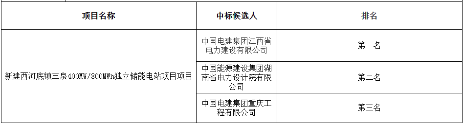中标候选人第一名为中国电建集团江西省电力建设有限公司,第二名为中国能源建设集团湖南省电力设计院有限公司,第三名为中国电建集团重庆工程有限公司。