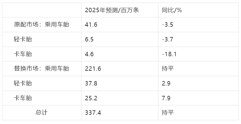 与2024年相比,原装配套市场,乘用车、轻型卡车和卡车轮胎的出货量预计分别下降3.5%、3.7%和18.1%,总计减少280万条;
