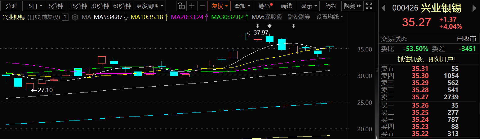 12月10日,兴业银锡的股价出现上涨,截至12月10日17:50分,兴业银锡涨4.04%,报35.27元/股。
