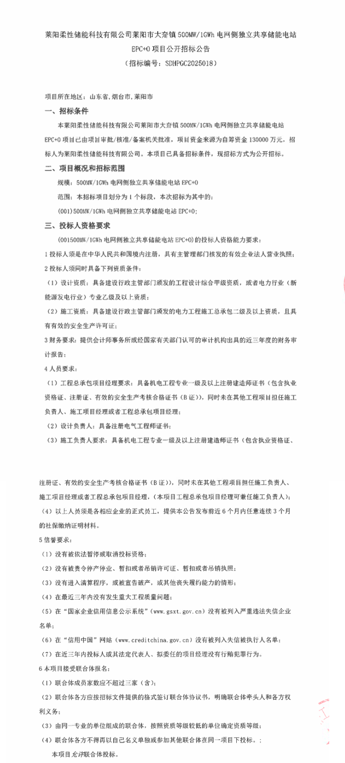 北极星储能网获悉,12月10日,莱阳柔性储能科技有限公司莱阳市大夼镇500MW/1GWh电网侧独立共享储能电站EPC+O项目公开招标公告发布。