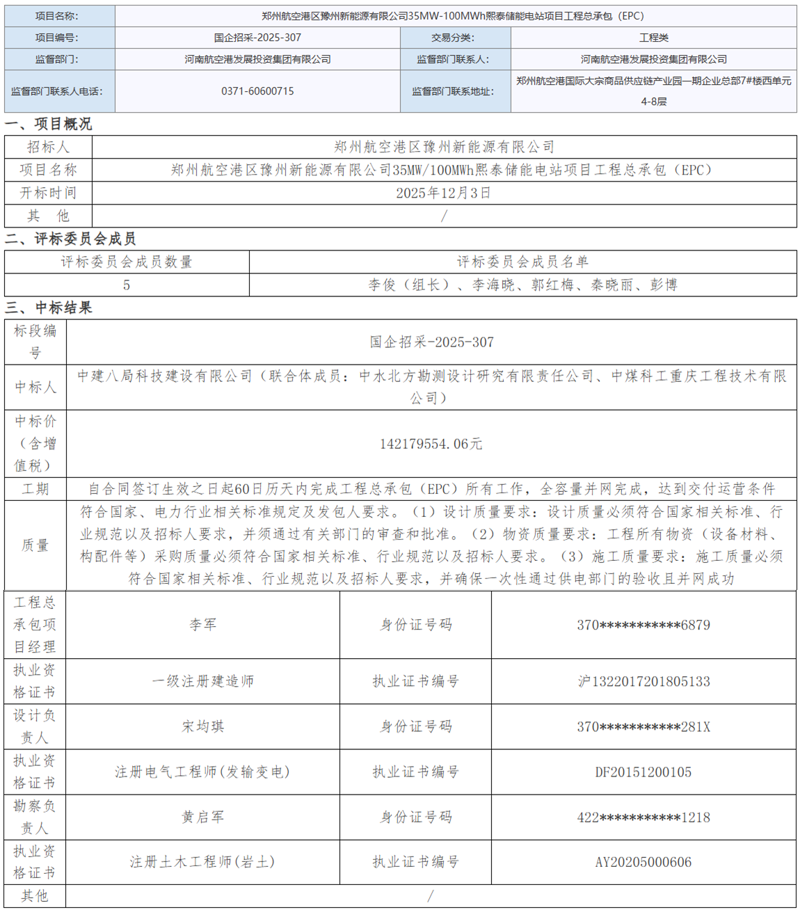北极星储能网获悉,12月9日,郑州航空港区豫州新能源有限公司35MW/100MWh熙泰储能电站项目工程总承包(EPC)中标结果公告。中建八局科技建设有限公司(联合体成员:中水北方勘测设计研究有限责任公司、中煤科工重庆工程技术有限公司)以142179554.06元中标该项目,折合单价1.422元/Wh。
