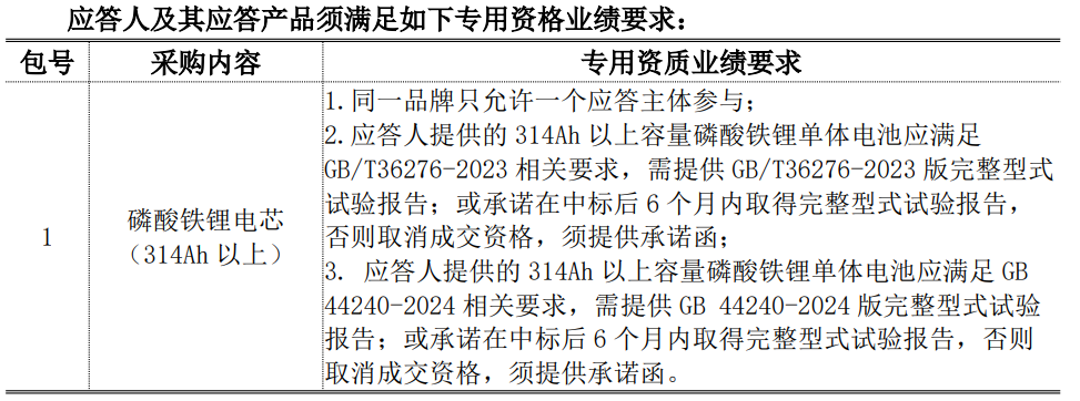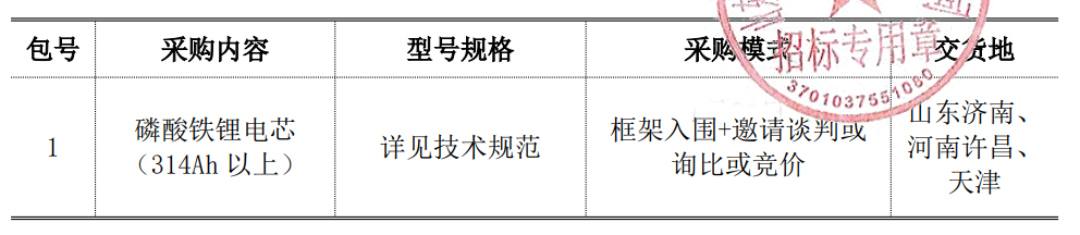 本次采购314Ah以上电芯,通过框架入围+邀请谈判或询比或竞价。