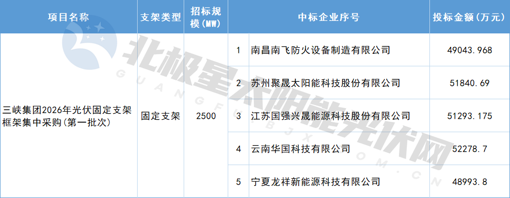 12月11日,三峡集团2026年光伏固定支架框架集中采购(第一批次)中标候选人公示,入围企业共计5家:南昌南飞防火设备制造有限公司、苏州聚晟太阳能科技股份有限公司、江苏国强兴晟能源科技股份有限公司、云南华国科技有限公司、宁夏龙祥新能源科技有限公司。
