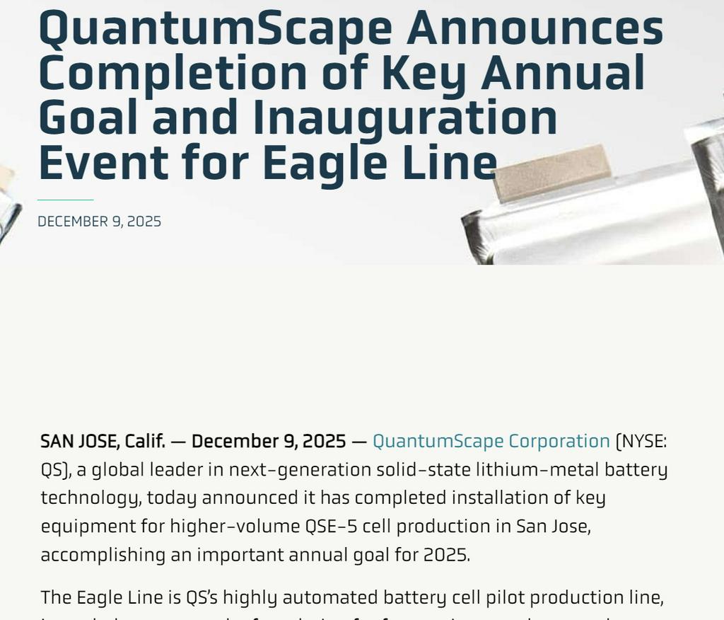 2025年12月09日,全球固态锂金属电池技术领军企业美国QuantumScape公司(纽交所代码:QS)宣布,其位于圣何塞的更高产能QSE-5电芯生产线“鹰隼(Eagle Line)”已完成关键设备安装,标志着公司2025年度核心目标如期达成。