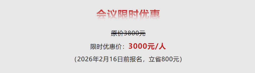 同时,会议门票新一轮限时优惠同步开启:原价3800元的会议门票,现仅需3000元(优惠截止2026年2月16日),错过此次优惠,后续将全额收费!无论是计划参展抢占商机,还是参会洞悉行业趋势,此刻都是锁定资源的最佳时机!
