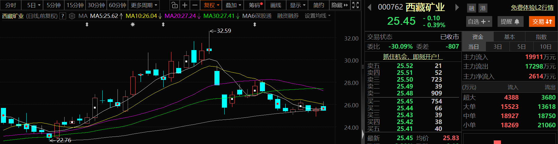 西藏矿业12月11日股价出现小幅下跌,截至11日收盘,西藏矿业跌0.39%,报25.45元/股。
