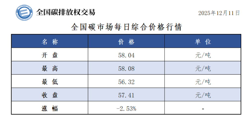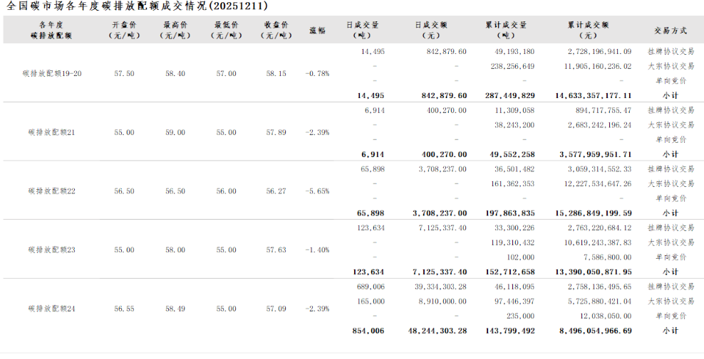 2025年1月1日至12月11日,全国碳市场碳排放配额成交量201,109,408吨,成交额12,351,545,063.54元。