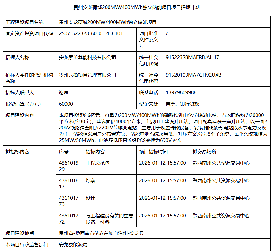 12月11日,安龙索英鑫能科技有限公司发布贵州安龙荷城200MW/400MWh独立储能项目项目招标计划,招标内容为工程总承包,项目计划于2026年1月12日正式招标。