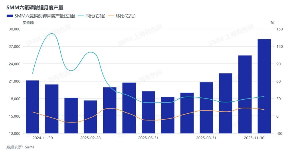 2025 年 11 月,中国六氟磷酸锂产量环比上涨约 11%,同比上升约 33.62%。
