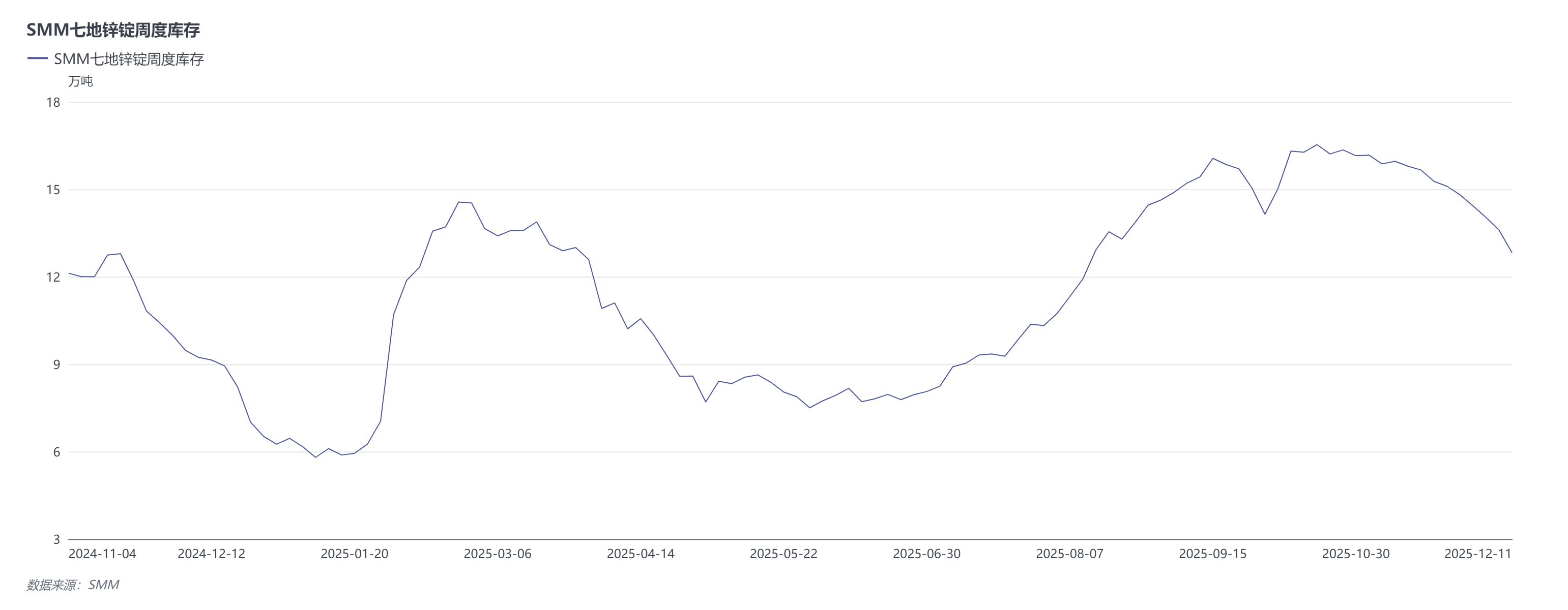此外,国内SMM七地锌锭周度库存也整体呈现去库态势,截至12月11日,SMM七地锌锭库存降至12.82万吨,也为锌价提供一定支撑。