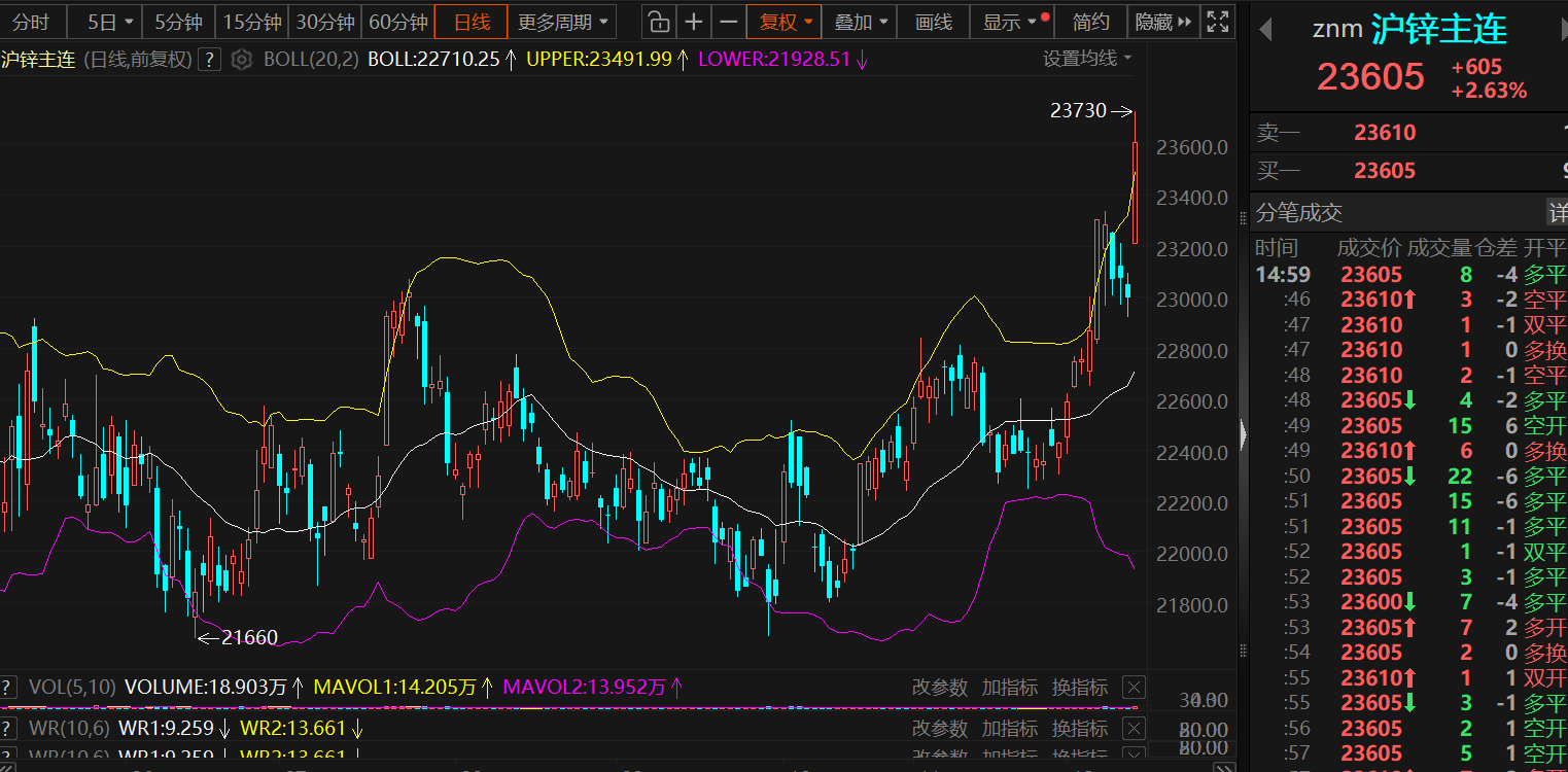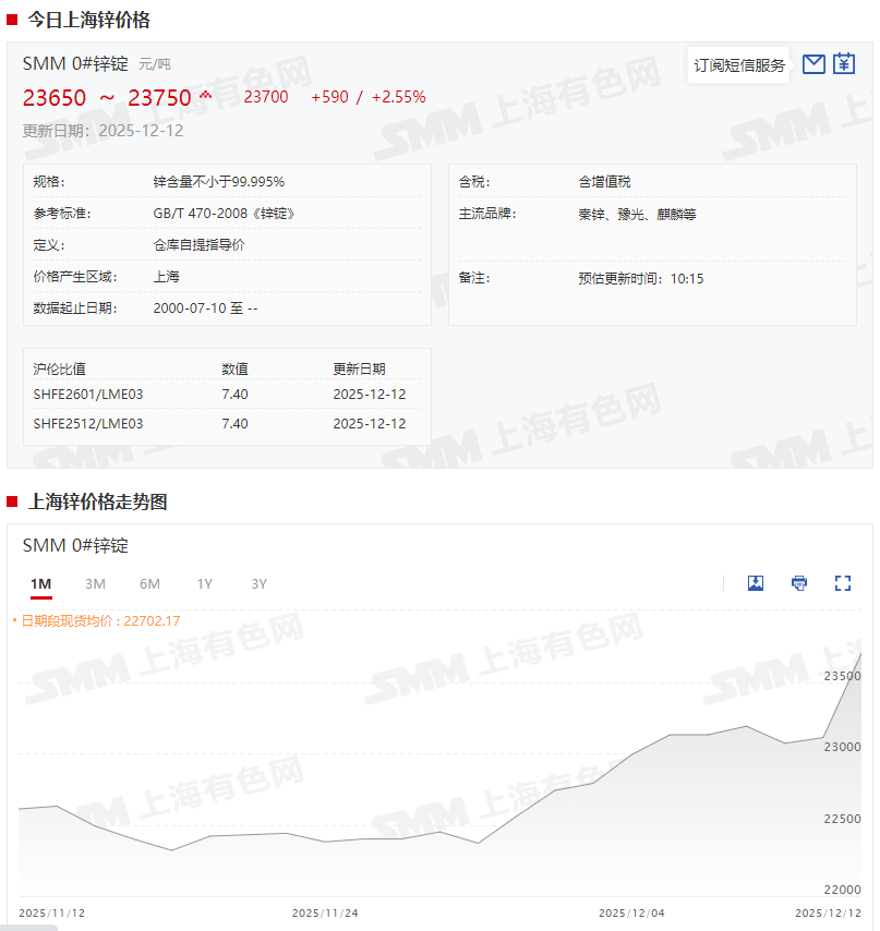 受海外伦锌大涨带动,沪锌在隔夜和12月12日日间补涨,截至日间收盘,沪锌主连以2.63%的涨幅报23605元/吨,盘中最高冲至23730元/吨,刷新2025年4月3日以来的新高。