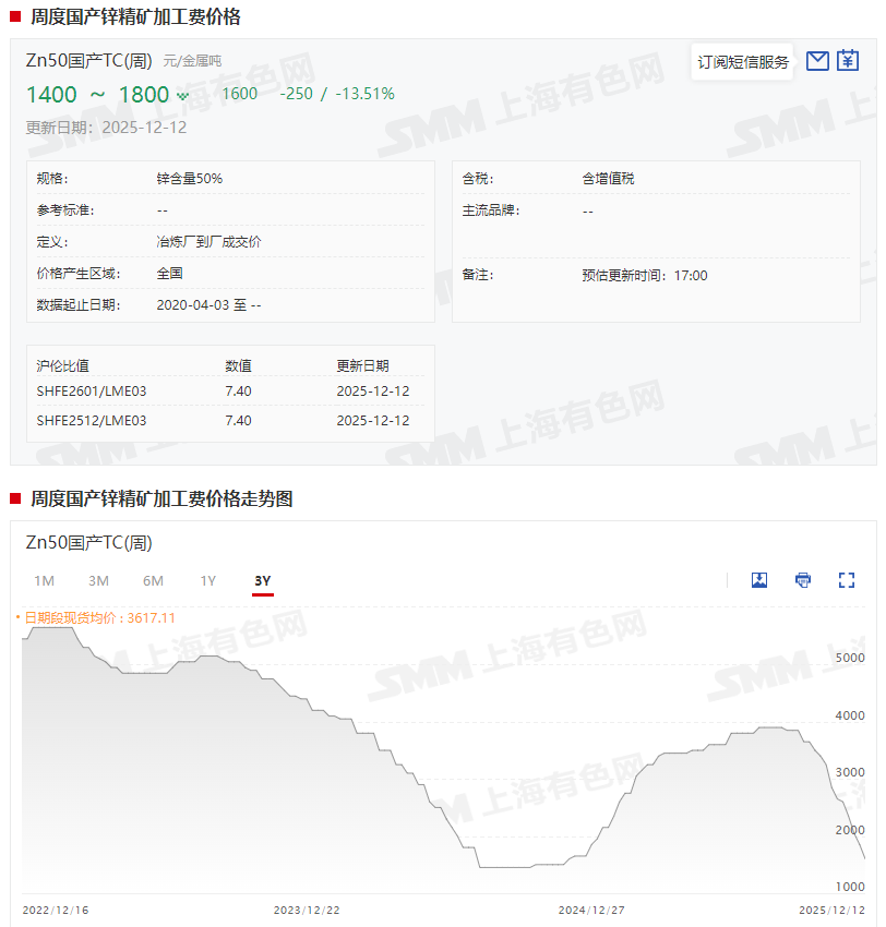 而锌精矿加工费的持续下跌也导致冶炼厂亏损逐步扩大,11月部分冶炼厂已经出现减产的情况,进入12月份之后,矿端北方部分矿企因冬季气温因素而陆续减停产,国内锌精矿产量环比继续走弱,虽然精炼锌冶炼厂规模也相较11月有所扩大,但整体表现还算旺盛的需求令冶炼厂持续抢购国产锌精矿,国内多地锌精矿加工费继续下滑,截至12月12日,国产锌精矿周度加工费降至1400~1800元/金属吨,均价报1600元/金属吨,降至2024年11月29日以来的新低。