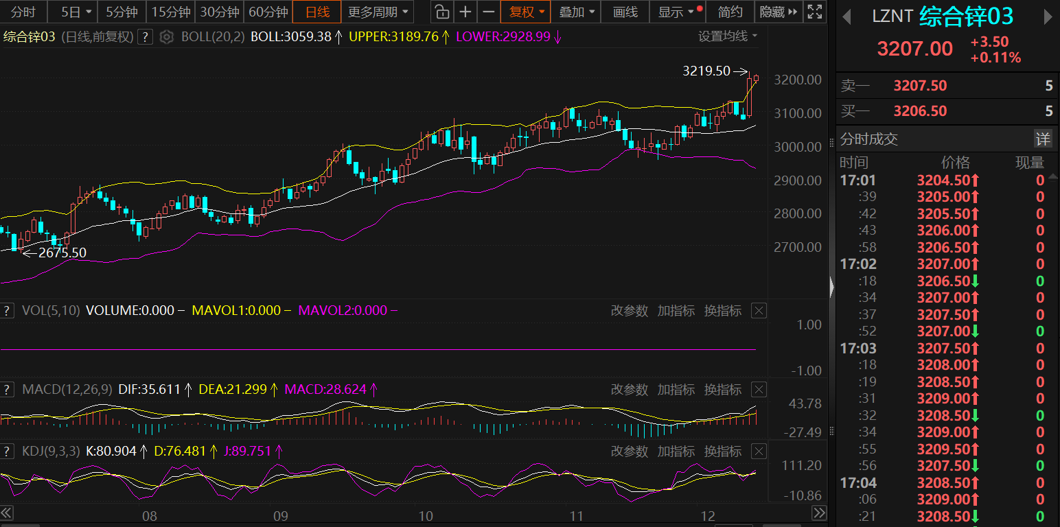 SMM 12月12日讯:昨日晚间,美元受到就业数据的拖累,录得两连跌。在整体宏观氛围向好的背景下,隔夜铜锌锡以及白银涨势喜人,其中伦锌隔夜大涨3.76%,录得一个大阳柱的同时,盘中最高冲至3219.5美元/吨,刷新2024年10月25日以来的新高。