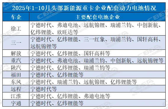 动力电池应用分会数据显示,1-10月头部新能源重卡企业主要配套动力电池情况如下:
