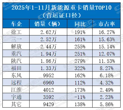 数据显示,1-11月全国新能源重卡销量TOP10企业分别是:徐工、三一、解放、重汽、陕汽、福田、东风、远程、江淮和宇通。