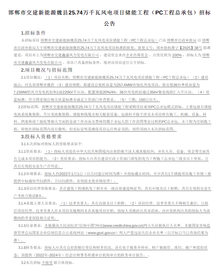 北极星储能网获悉,12月12日,邯郸市交建新能源魏县 25.74 万千瓦风电项目储能工程(PC 工程总承包)招标公告。