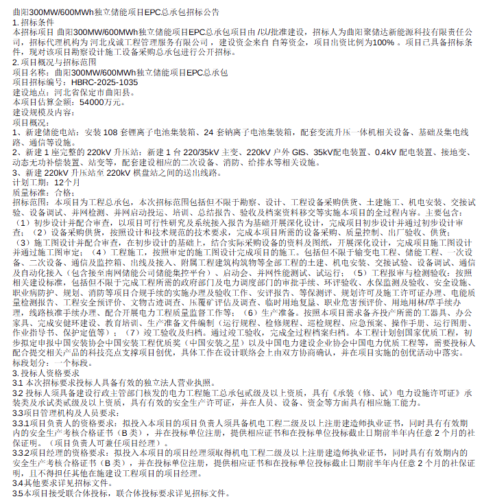 北极星储能网获悉,12月12日,曲阳300MW600MWh独立储能项目EPC总承包招标公告发布