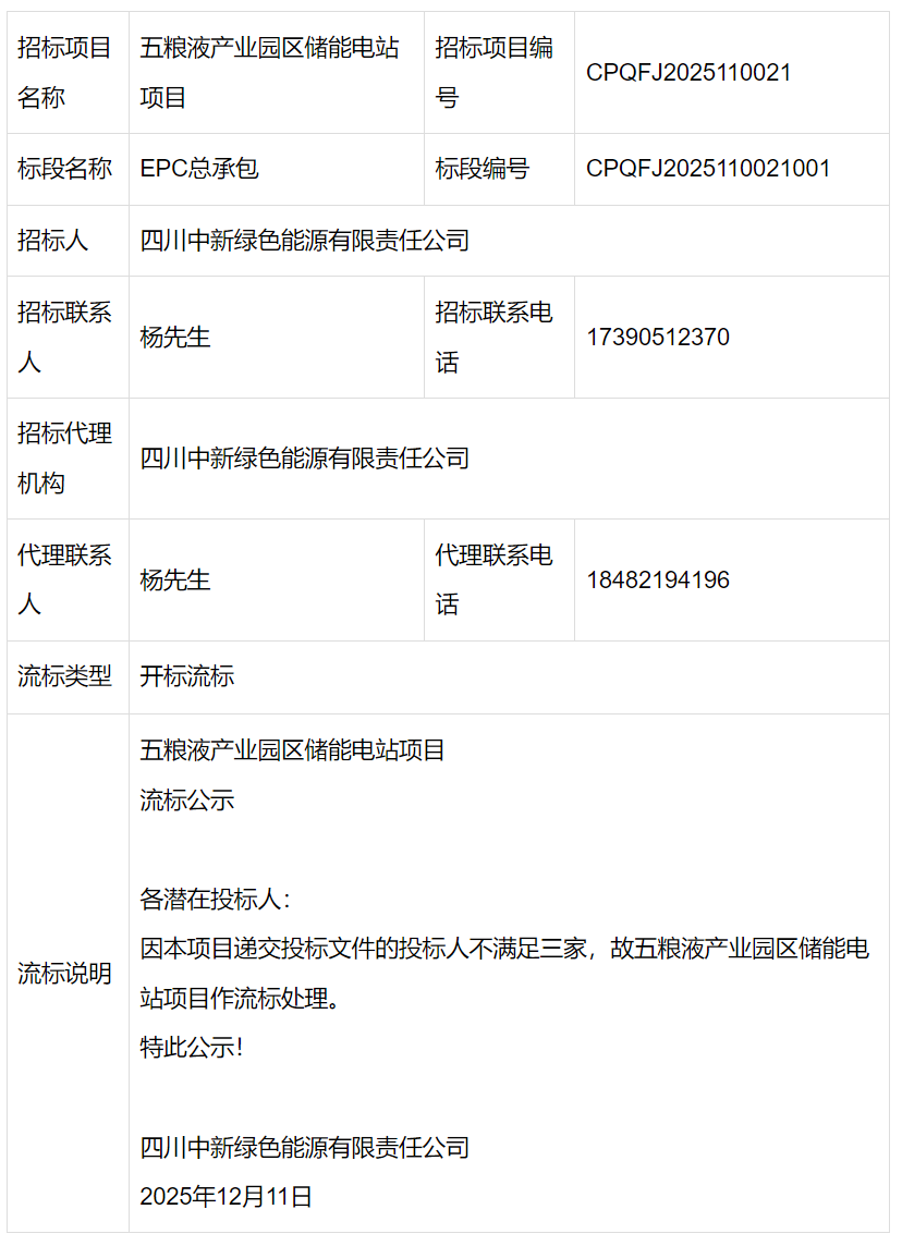 2025年12月11日,宜宾市公共资源交易中心发布“五粮液产业园区储能电站项目流标公示”,因递交投标文件的投标人数量未满足三家要求,故五粮液产业园区储能电站项目作流标处理。