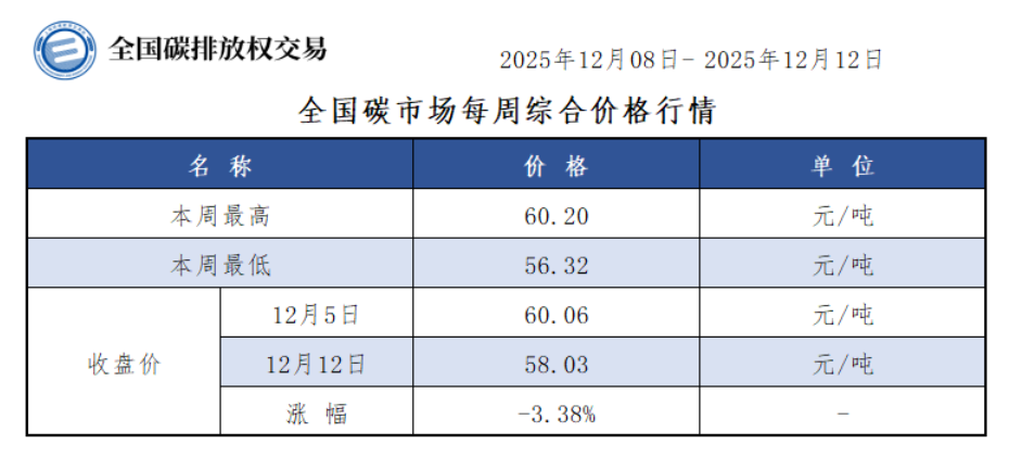 本周全国碳市场综合价格行情为:最高价60.20元/吨,最低价56.32元/吨,收盘价较上周五下跌3.38%。