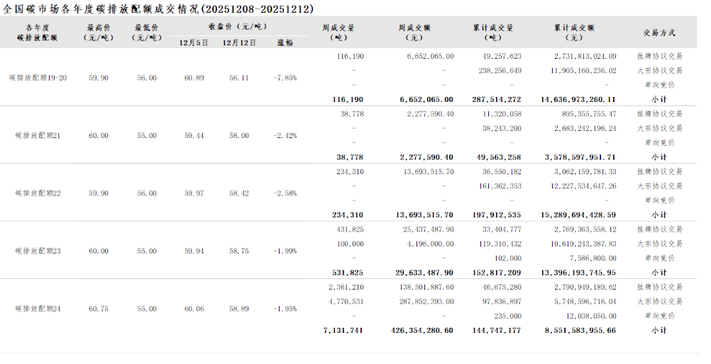 截至2025年12月12日,全国碳市场碳排放配额累计成交量832,554,451吨,累计成交额55,453,043,342.02元。