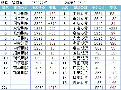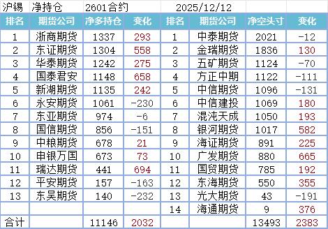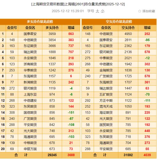 具体来看,sn2601 合约多头前 20 席位合计增持 3688 手至 29245 手,空头合计增持 4039 手至 31592 手,多空增仓力度接近。