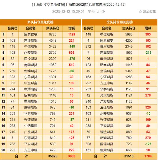 sn2602 合约多头前 20 席位合计增持 3008 手至 35025 手,空头合计增持 1784 手至 31510 手,多头增仓幅度显著领先。