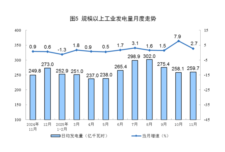 规上工业电力生产保持增长。11月份,规上工业发电量7792亿千瓦时,同比增长2.7%;日均发电量259.7亿千瓦时。1—11月份,规上工业发电量88567亿千瓦时,同比增长2.4%。
