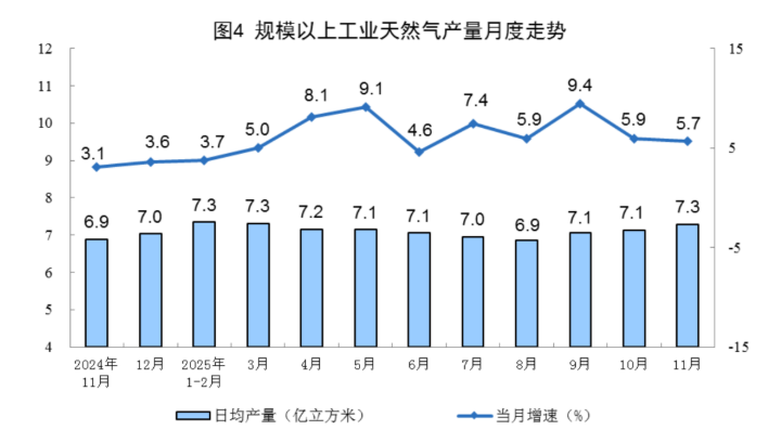 天然气生产稳定增长。11月份,规上工业天然气产量219亿立方米,同比增长5.7%;日均产量7.3亿立方米。