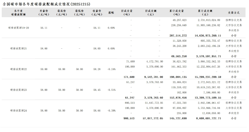 2025年1月1日至12月15日,全国碳市场碳排放配额成交量203,499,147吨,成交额12,490,456,555.16元。
