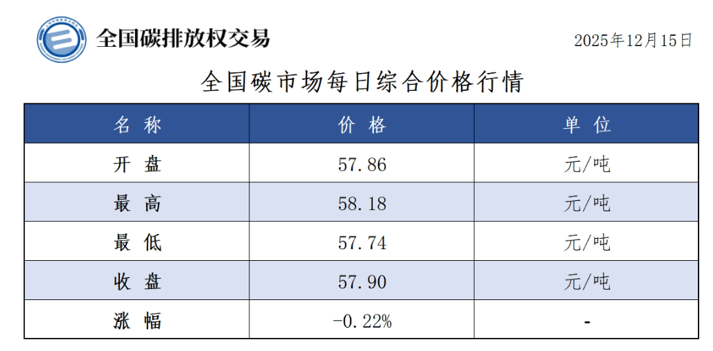 今日全国碳市场综合价格行情为: 开盘价57.86元/吨,最高价58.18元/吨,最低价57.74元/吨,收盘价57.90元/吨,收盘价较前一日下跌0.22%。