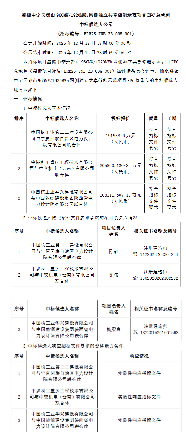 12月12日,盛储中宁天都山960MW/1920MWh网侧独立共享储能示范项目EPC总承包-中标候选人公示。
