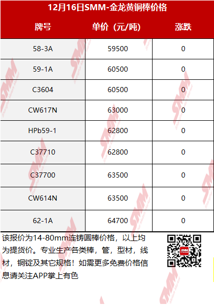 【SMM价格】2025年12月16日金龙黄铜棒价格