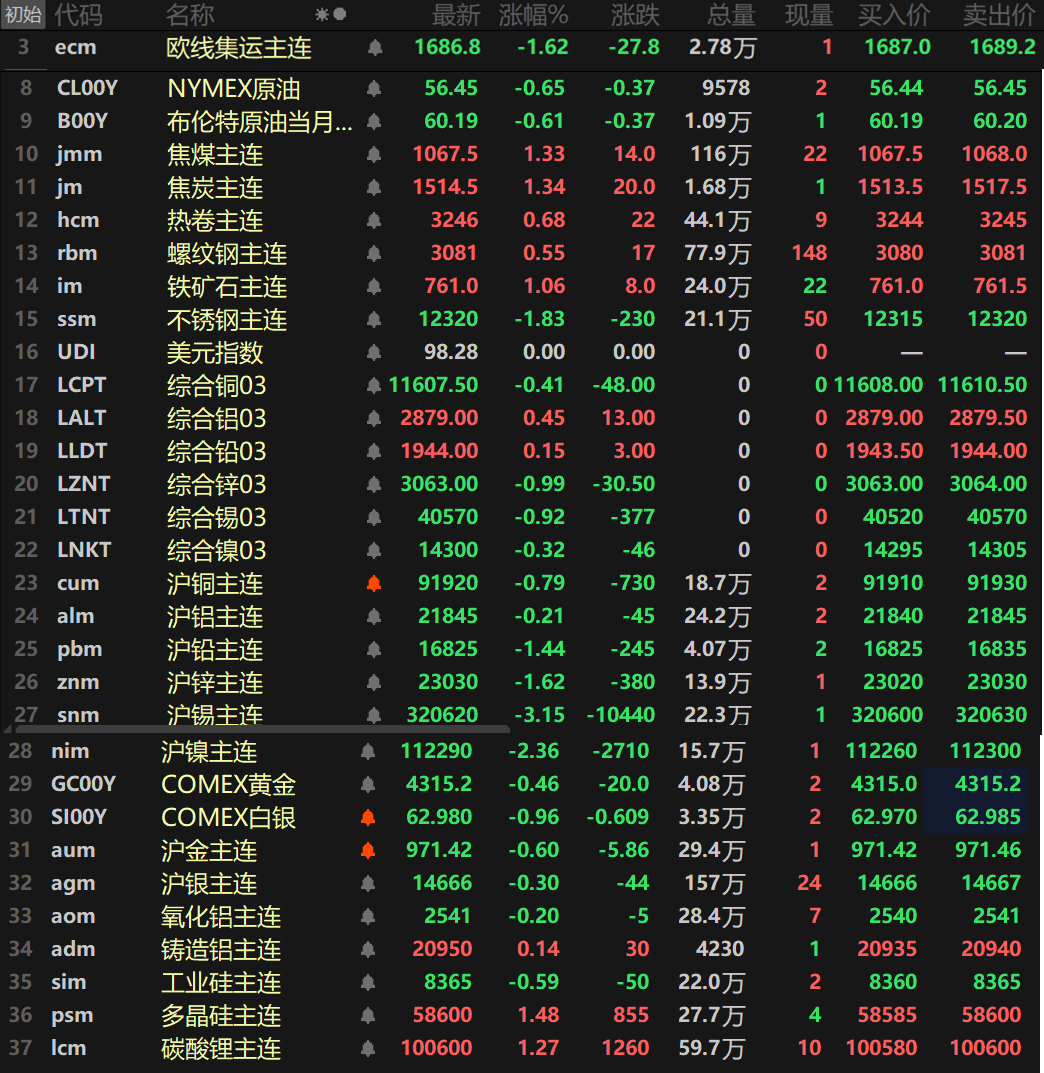 此外,碳酸锂主连涨1.27%,多晶硅主连涨1.48%,工业硅主连跌0.59%。欧线集运主连跌1.62%报1686.8。