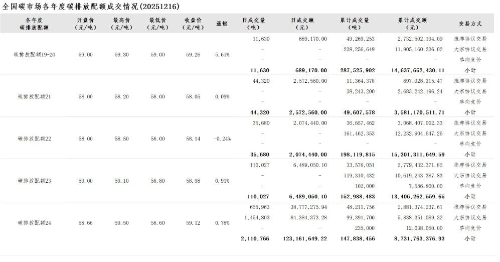 2025年1月1日至12月16日,全国碳市场碳排放配额成交量205,811,570吨,成交额12,625,443,424.48元。