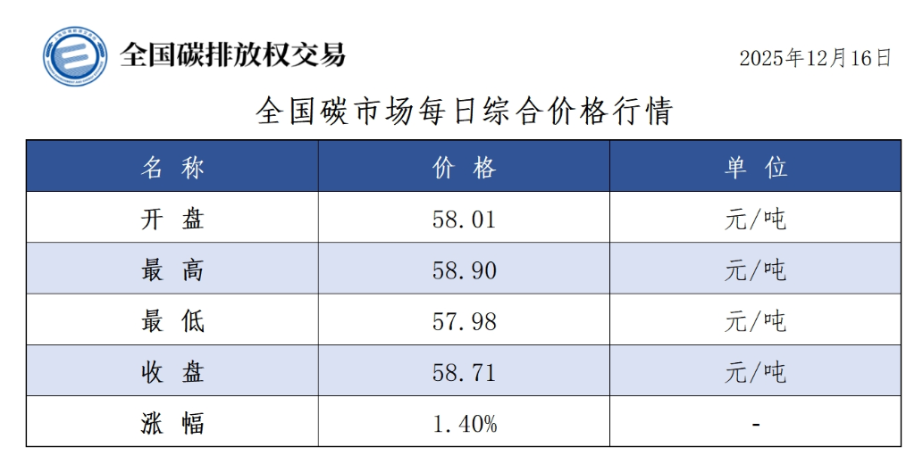 今日全国碳市场综合价格行情为: 开盘价58.01元/吨,最高价58.90元/吨,最低价57.98元/吨,收盘价58.71元/吨,收盘价较前一日上涨1.40%。