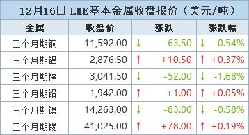 伦敦时间12月16日17:00(北京时间12月17日01:00),LME三个月期铜下跌63.5美元,或0.54%,收报每吨11,592美元。