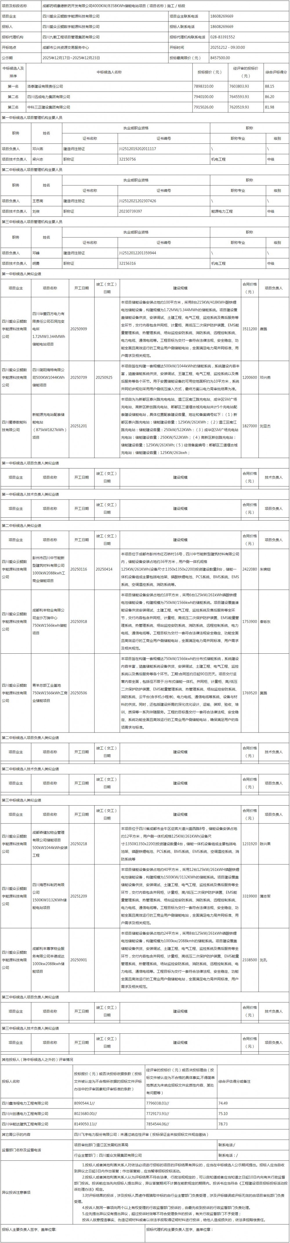 成都药明康德新药开发有限公司4000KW/8358KWh储能电站项目(项目名称)施工 / 标段评标结果公示