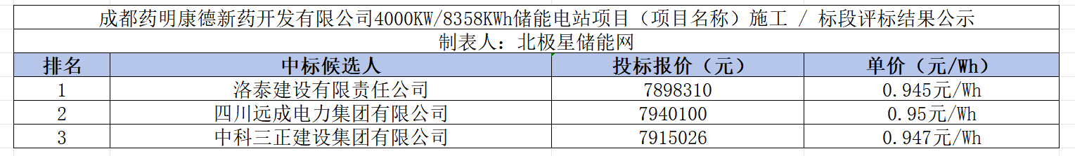 北极星储能网获悉,12月16日,成都药明康德新药开发有限公司4000KW/8358KWh储能电站项目(项目名称)施工 / 标段评标结果公示。