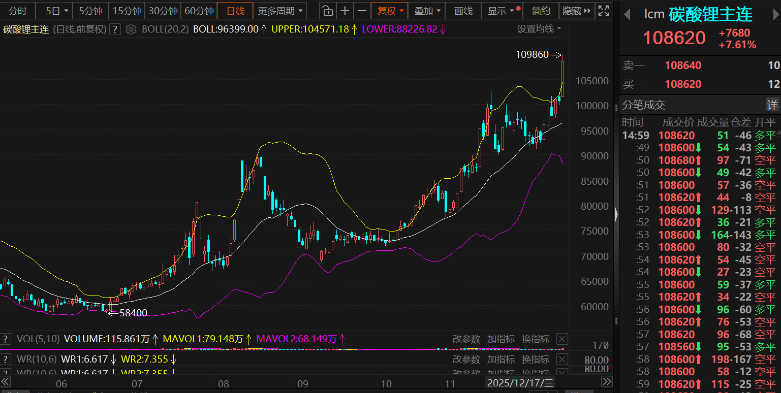 消息面上,今日碳酸锂期货主力合约显著上涨,盘中一度涨超8%,截至日间收盘,碳酸锂主连以7.61%的涨幅报108620元/吨,盘中最高冲至109860元/吨,刷新2024年5月10日以来的新高。