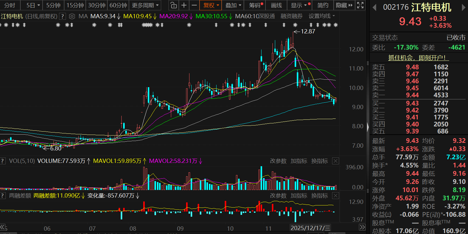 在今日能源金属板块大涨的背景下,江特电机在早间开盘前期逆转开盘跌势,股价最高一度拉涨逾5%,随后涨幅收窄至3%左右,截至日间收盘,江特电机以3.63%的涨幅报9.43元/股。