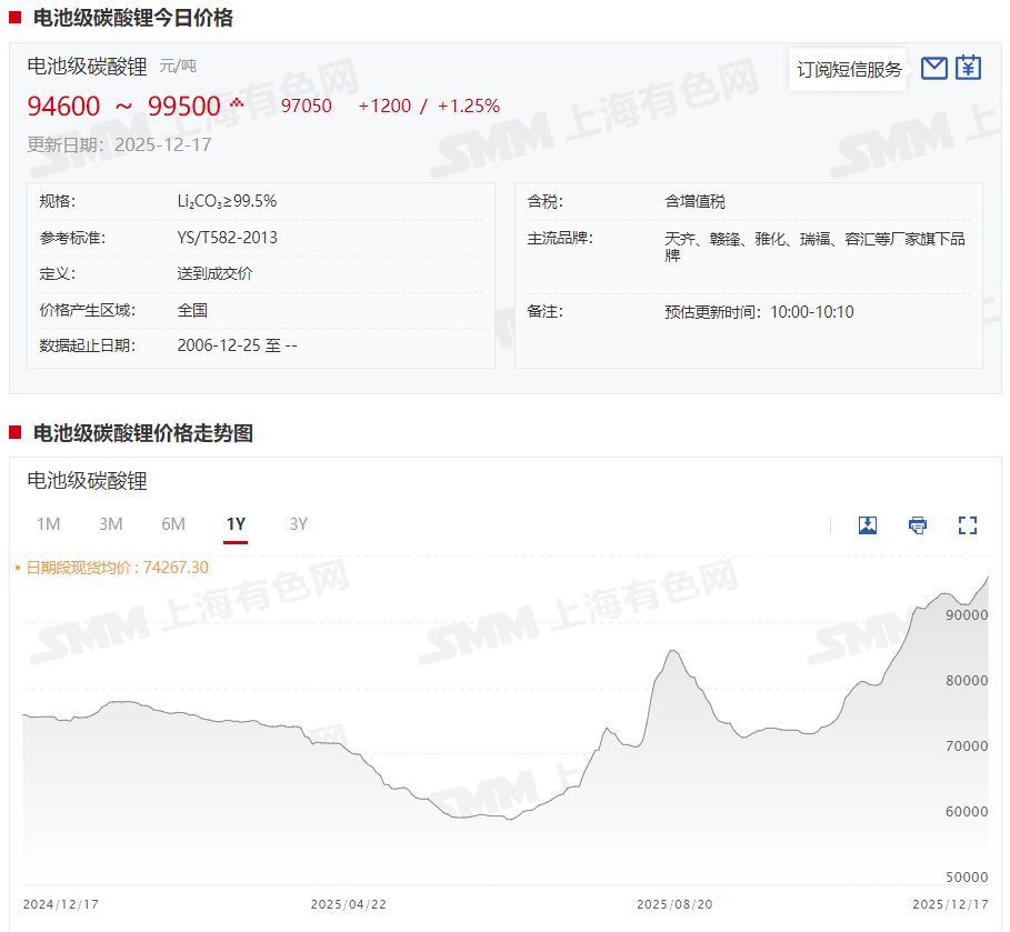 现货价格方面,据SMM现货报价显示,截至12月17日,电池级碳酸锂现货报价涨至94600~99500元/吨,均价报97050元/吨,继续刷新其年内阶段新高。