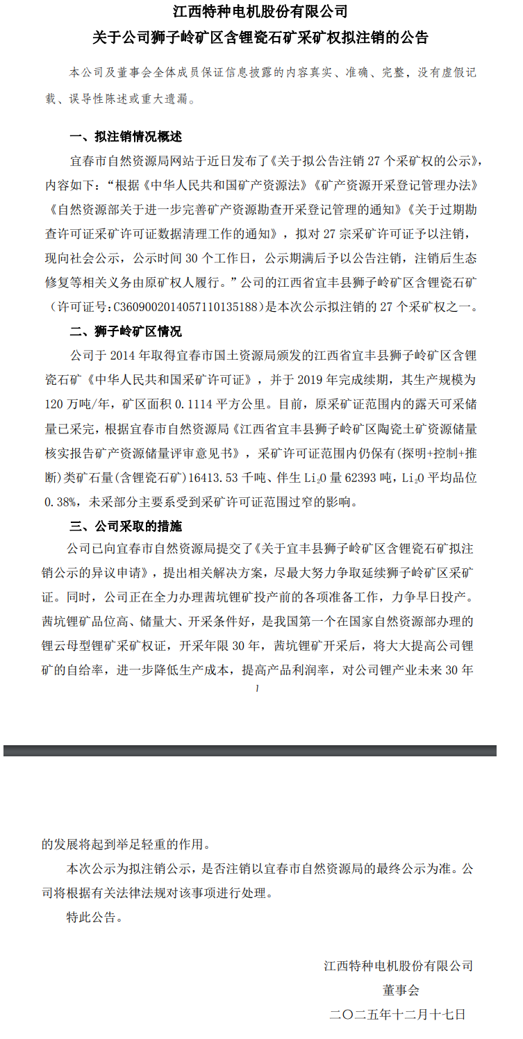 值得一提的是,12月16日,针对公司旗下江西省宜丰县狮子岭矿区含锂瓷石矿被宜春市自然资源部网站列入本次公示拟注销的27 个采矿权之一的情况,江特电机发布公告称,公司已向宜春市自然资源局提交了《关于宜丰县狮子岭矿区含锂瓷石矿拟注销公示的异议申请》,提出相关解决方案,尽最大努力争取延续狮子岭矿区采矿证。同时,公司正在全力办理茜坑锂矿投产前的各项准备工作,力争早日投产。
