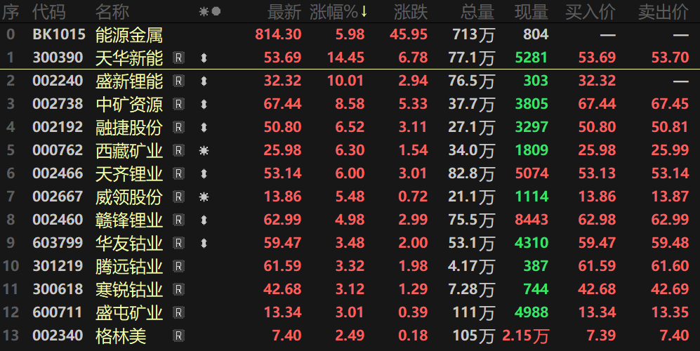 SMM 12月17日讯:今日,受消息面刺激,碳酸锂期货价格大幅拉涨,而能源金属板块也在连跌4个交易日后于12月17日一同走高,指数盘中一度涨近6%。截至日间收盘,能源金属板块以5.98%的涨幅报814.3。个股方面,天华新能涨逾14%,盛新锂能以10.01%的涨幅封死涨停板,中矿资源涨逾8%,融捷股份、天齐锂业、西藏矿业等多股纷纷跟涨。