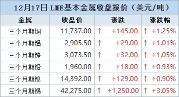 伦敦时间12月17日17:00(北京时间12月18日01:00),LME三个月期铜上涨145美元,或1.25%,收报每吨11,737美元。