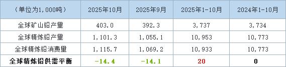 2025年10月全球铅市为供应短缺1.44万吨,9月为供应短缺1.41万吨。2025年1-10月全球铅市为供应过剩2.0万吨,上年同期为供需平衡。