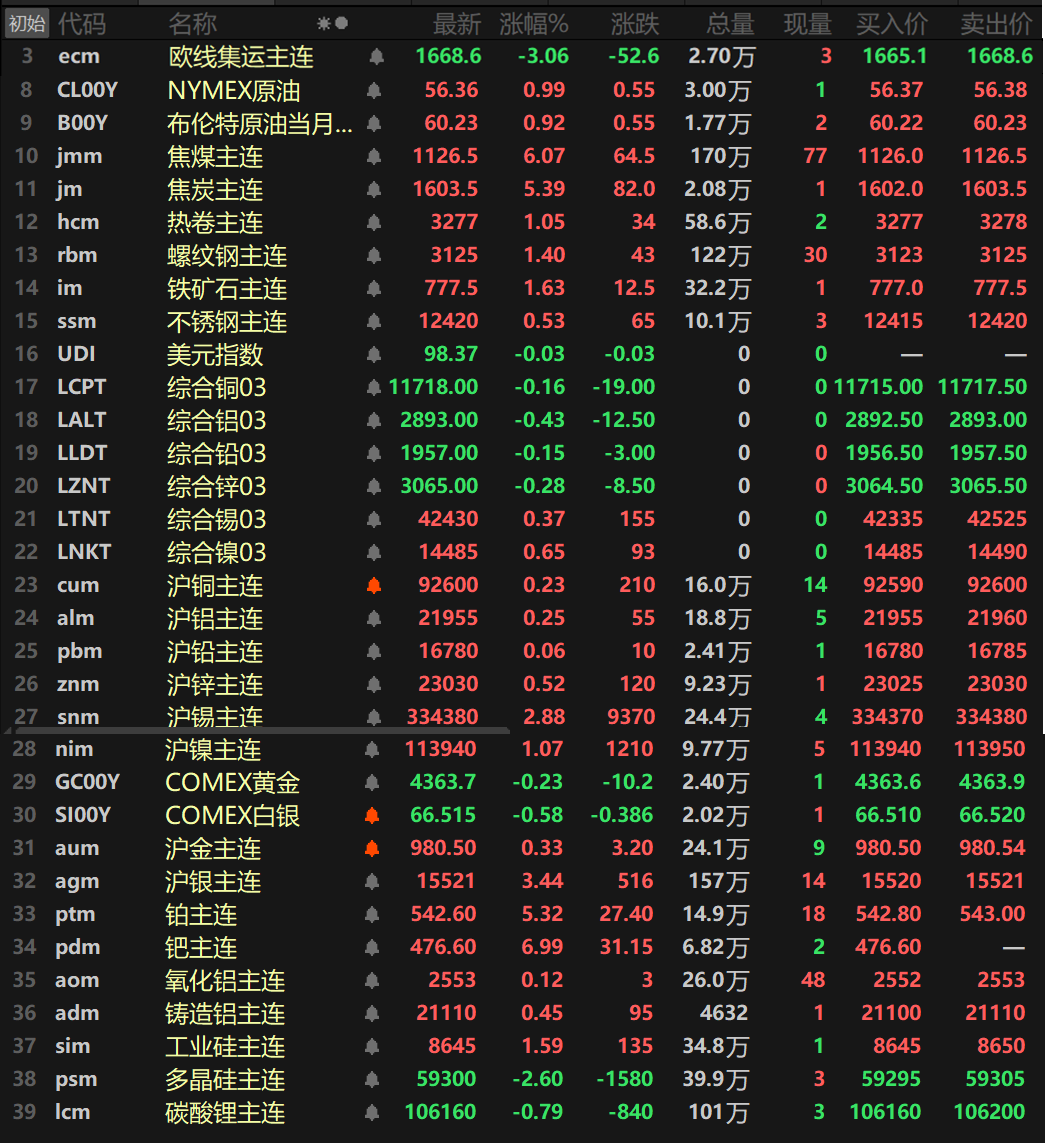 截至日间收盘,内盘基本金属普涨,沪锡涨2.88%,沪镍涨1.07%,其余金属涨幅均在1%以内。氧化铝主连涨0.12%,铸造铝主连涨0.45%。