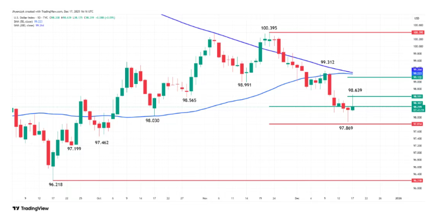 Fxempire分析称,美元面临劳动力市场持续疲软以及美联储可能在2026年初进行鸽派政策调整带来的阻力。随着位于99.264的200日移动均线即将下穿位于99.222的50日移动均线形成“死叉”,交易员正为周四发布的11月CPI数据可能引发的市场波动做好准备。