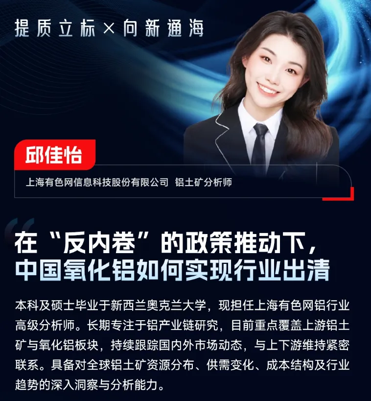 在此行业变革的关键节点,2026年4月8日举办的 AICE2026铝产业博览会,特别邀请到上海有色网铝土矿分析师邱佳怡女士,带来《在“反内卷”的政策推动下,中国氧化铝如何实现行业出清》专题论坛。作为深耕铝土矿与氧化铝领域的资深专家,邱佳怡女士对行业供需格局、政策导向及成本逻辑有着深刻洞察。这场深度分享将聚焦氧化铝产能和行业生存模式革新两大核心痛点,共同探讨氧化铝行业在政策引导下的产能优化、生存升级与可持续发展路径。
