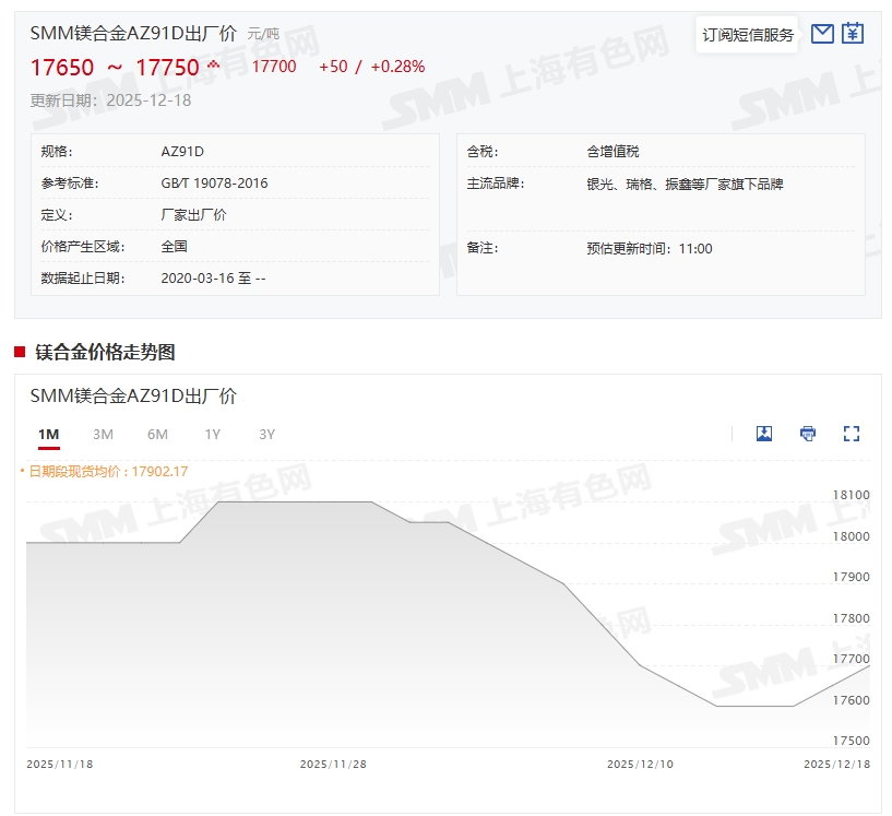 据SMM报价显示:镁合金AZ91D12月18日的报价为17650~17750元/吨,其均价为17700元/吨,较前一交易日涨0.28%,这是其连续第二个交易日上涨。本周,中国镁合金的市场主流含税出厂价格为17550-17750元/吨,中国镁合金的主流FOB价格为2460-2510美元/吨。