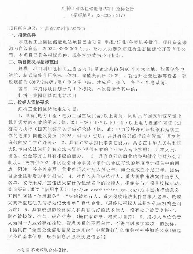 北极星储能网讯:2025年12月17日,泰兴市虹桥生态园建设开发有限公司发布虹桥工业园区储能电站项目招标,项目资金来源为自筹资金,总投资20032万元,此次招标最高限价为19632万元,约合单价0.96元Wh。
